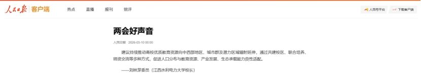 刘林芽:“建议持续推动高校优质教育资源向中西部地区、城市群及潜力区域辐射延伸,通过共建校区、联合培养、师资交流等多种方式,促进人口分布与教育资源、产业发展、生态承载能力良性适配。”